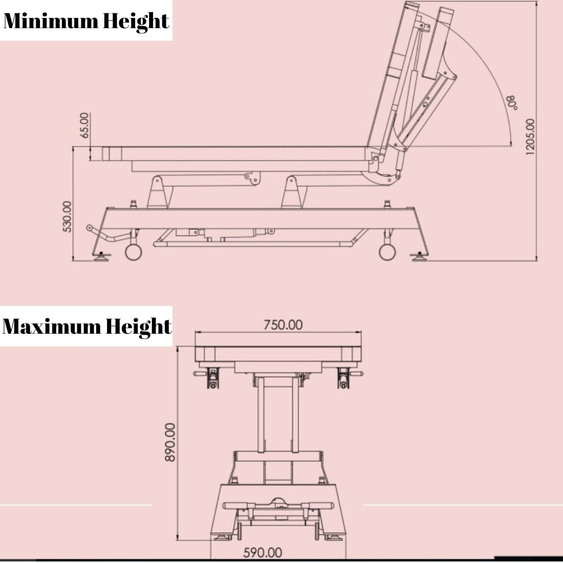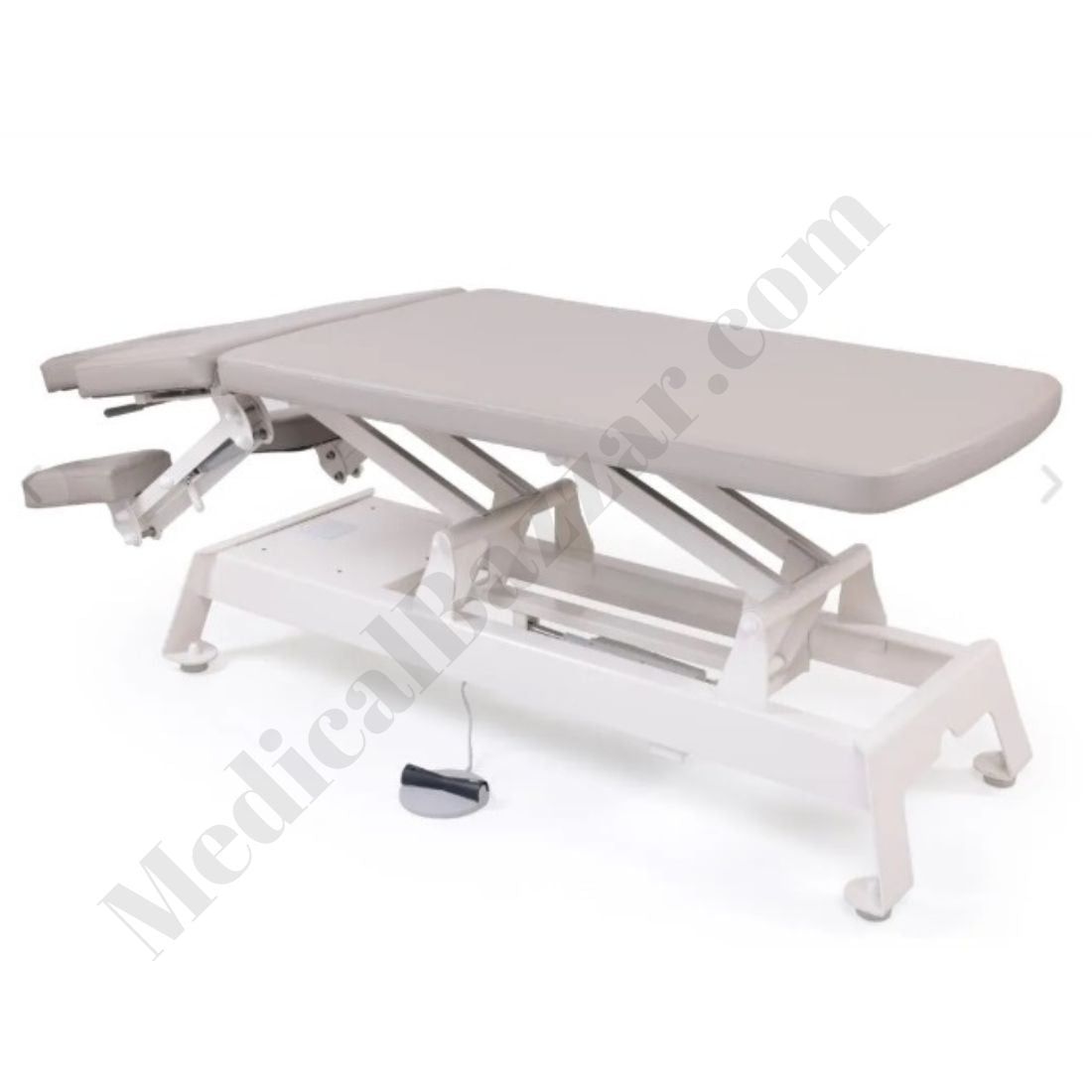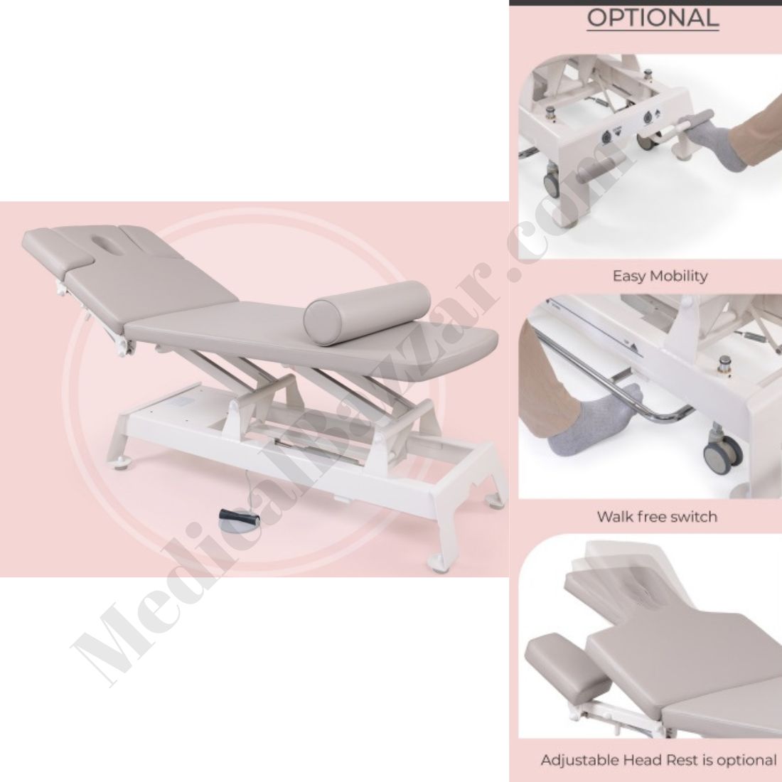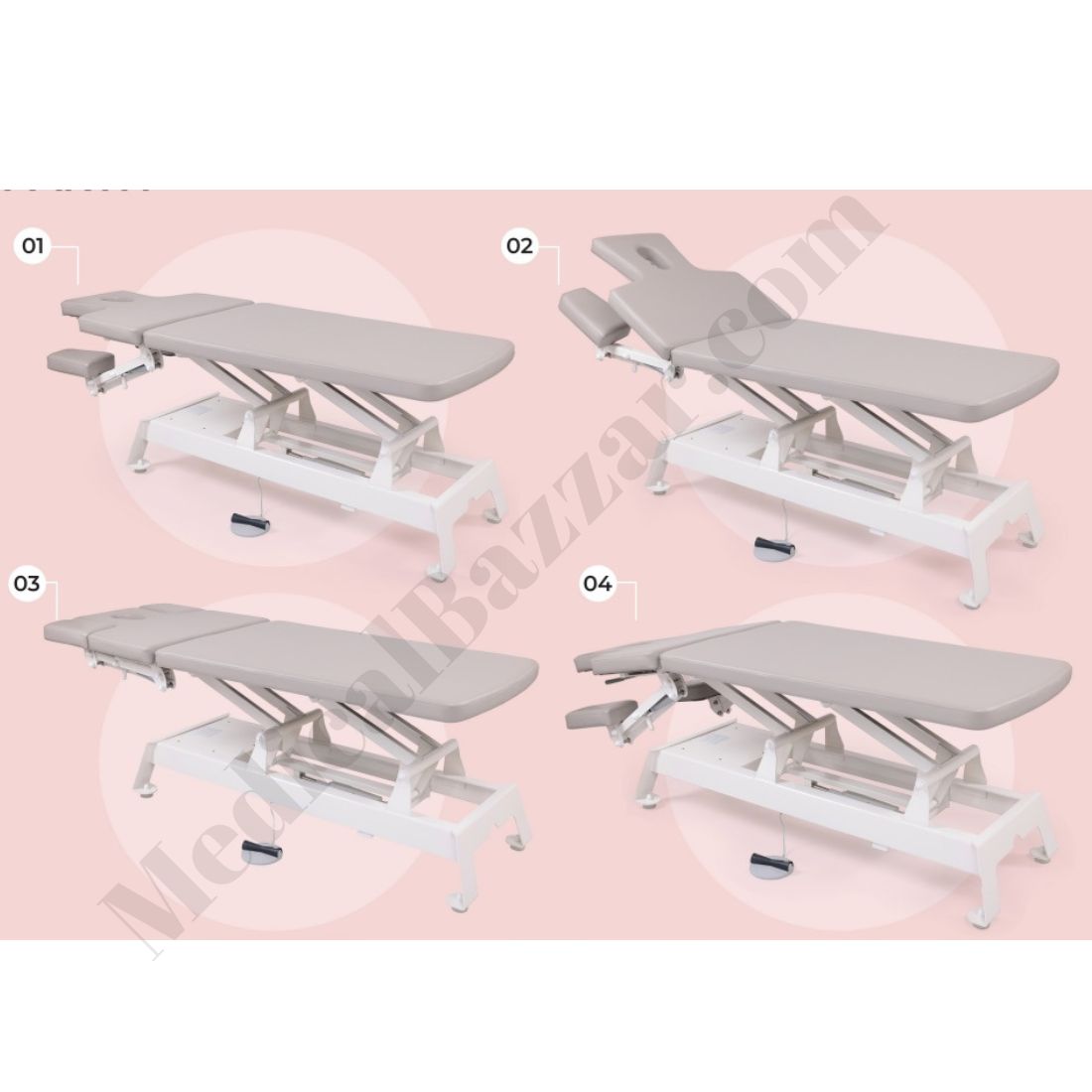 AMP-TC04A - acco 4 Section Physiotherapy Treatment Couch (Pro) - Supplied with walk free switch to operate the table from both sides of the table and easy mobility feature to put the table on wheels and move around easily. 1 x gas spring to adjust backrest at various positions and 2 x gas springs to lower the armrests on both sides of the table for neck and shoulder comfort