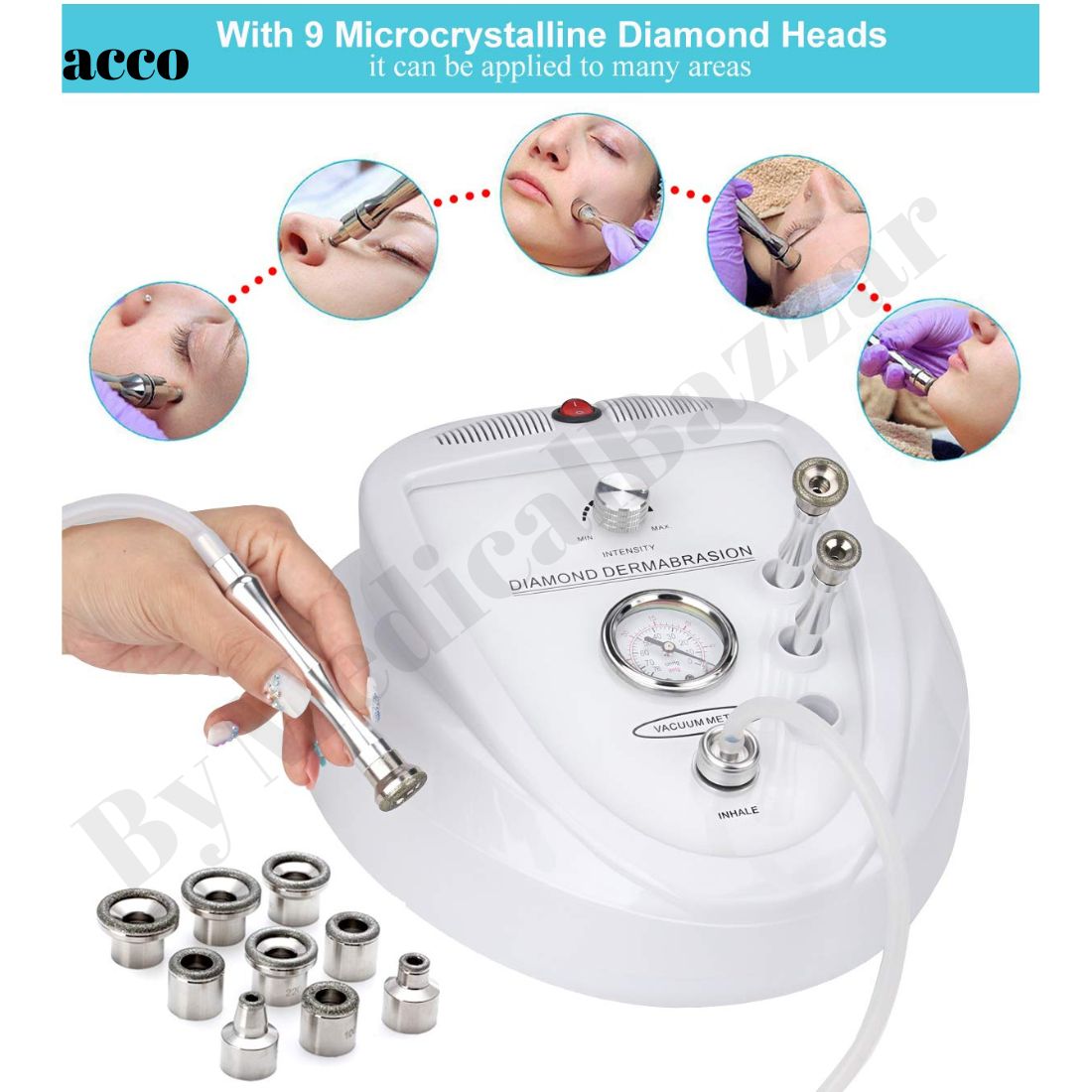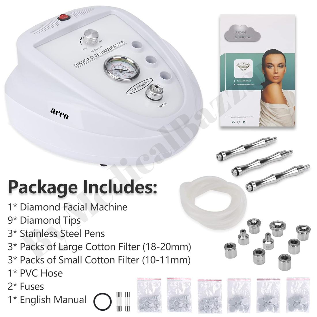 Pack Includes - 1* Diamond Peeling machine 3* Stainless steel wands 9* Diamond tips 1* Pack Large cotton filter( 18mm 50pcs) 1* Pack Small cotton filter( 11mm 50pcs) 1* PVC hose 1* English manual