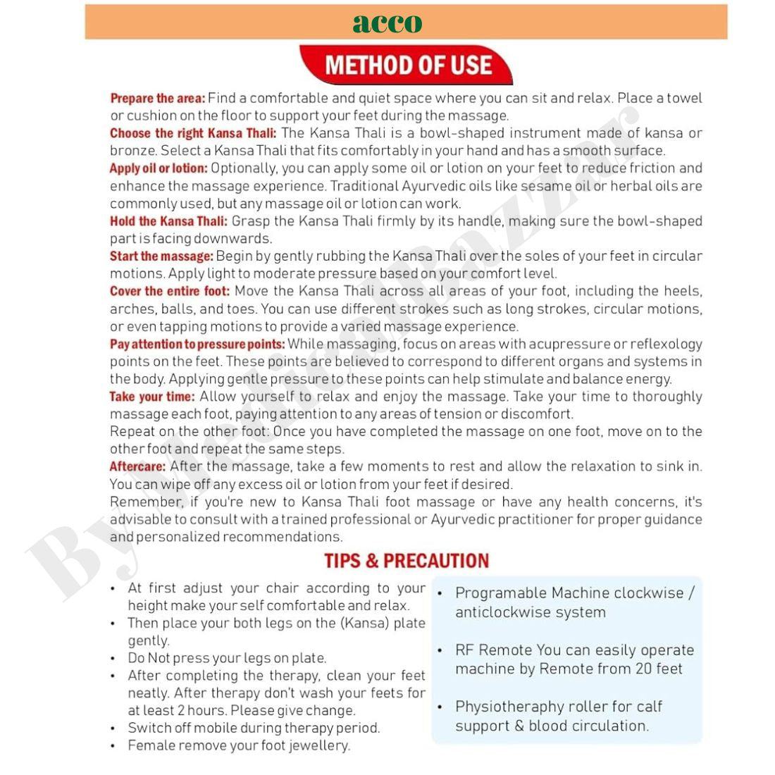 Experience the ultimate relaxation with the acco Kansya Thali Automatic Foot Massager. Designed with advanced technology, this massager stimulates pressure points for improved circulation and relief from tension and pain. Don't wait any longer, give your feet the care they deserve with our premium foot massager.