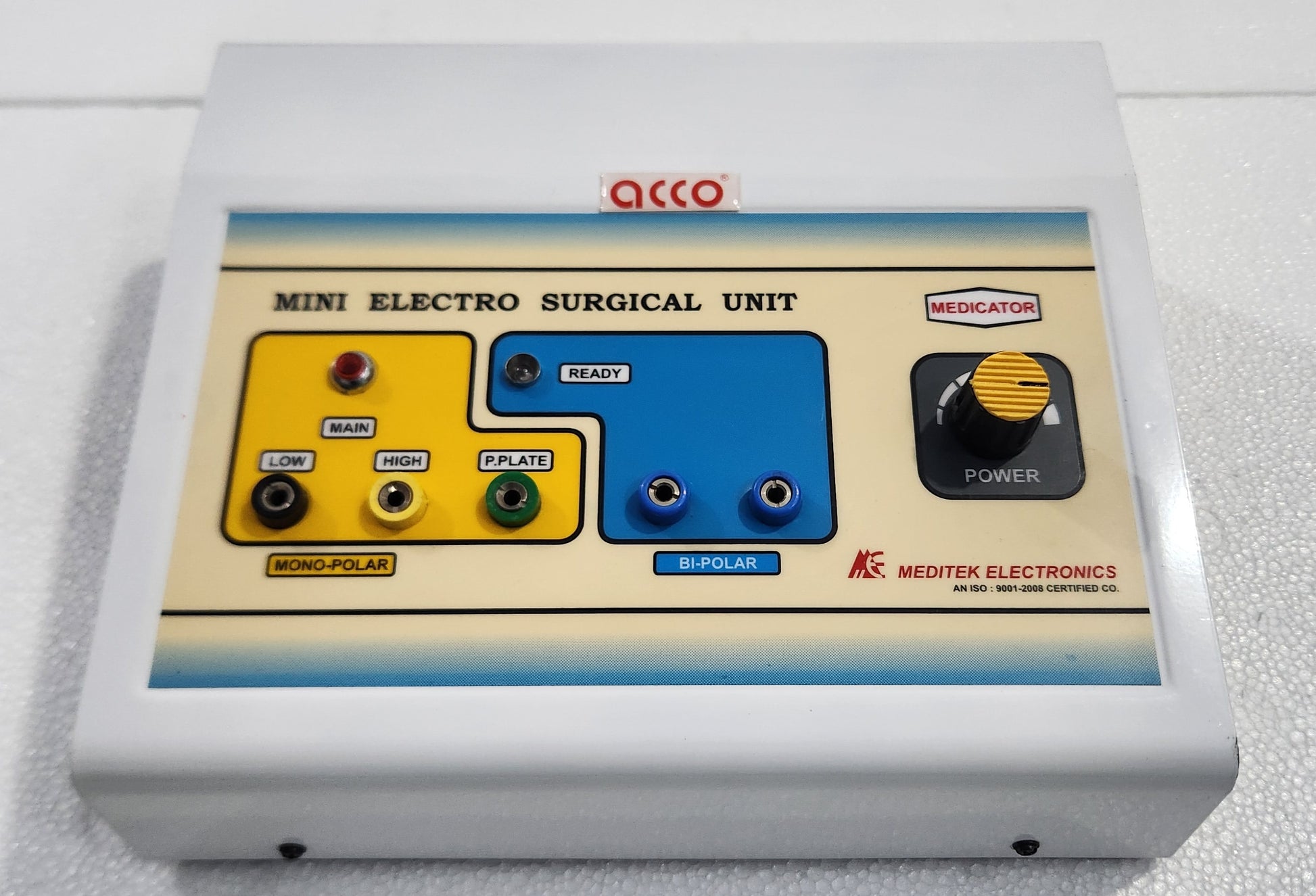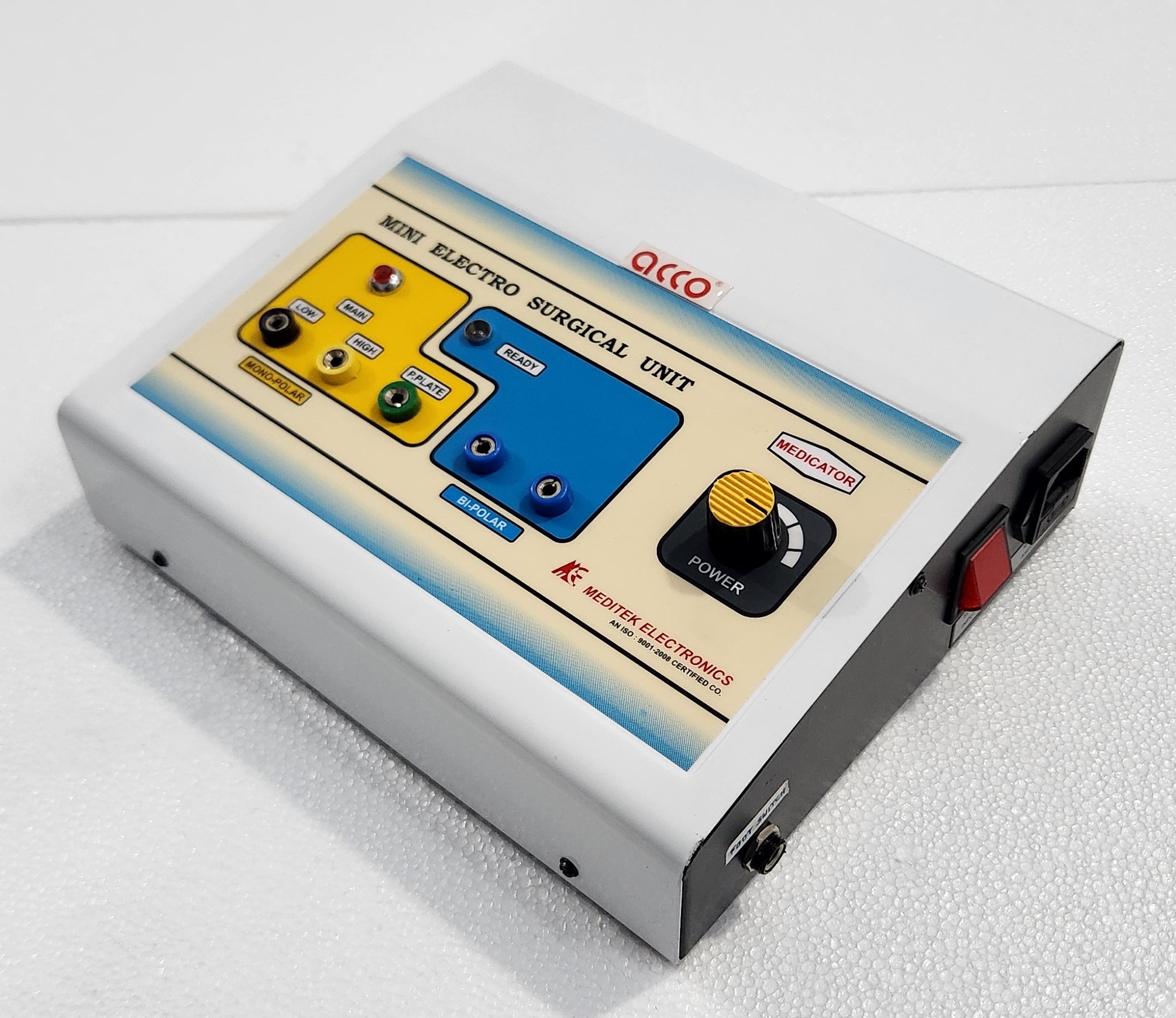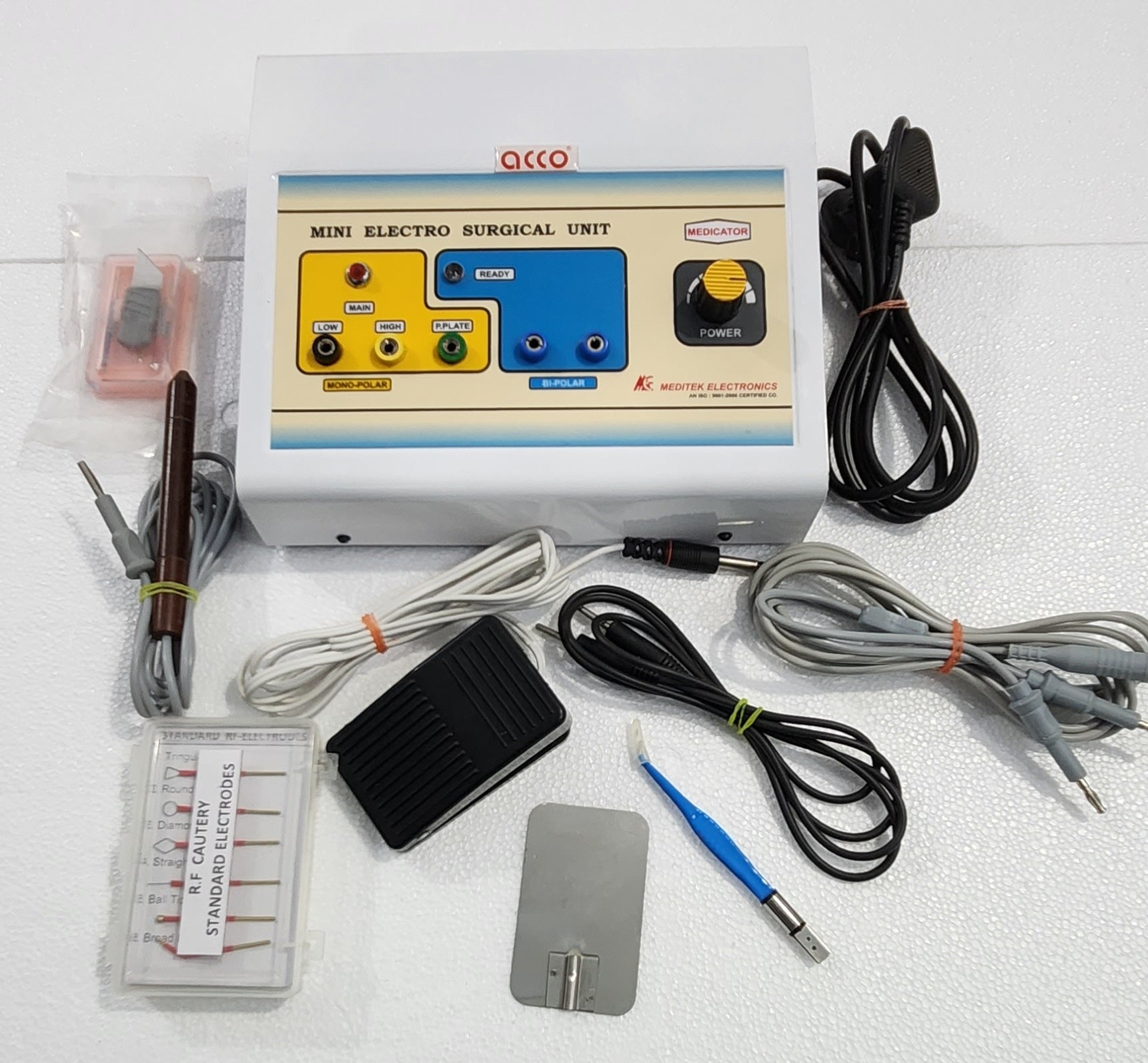 Mini Electro Surgical Unit with Spark Gap Generator. Most suitable for skin Surgeons for Dessication. Fulguration, Coagulation and Epilation Bipolar and Unipolar current modes are available.