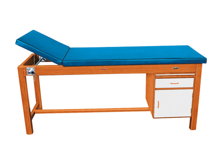 Product description:Standard treatment cum examination couch with vinyl upholstered top is provided with adjustable backrest with storage facility. Specifications : * Construction : Solid wood constructed frame work is fitted with well-padded 40mm thick top & top is divided in two sections. * Size : Top 182 cm long x 61cm wide x 80 cm high. * Backrest: 46cm long & can be continuously adjustable in height for desired position.* Writting Board : One laminated writting board is provided under the Top. * Storage : One drawer & One small cupboard is provided underneath the top for storage. * Finish : Natural wood-polish finish.